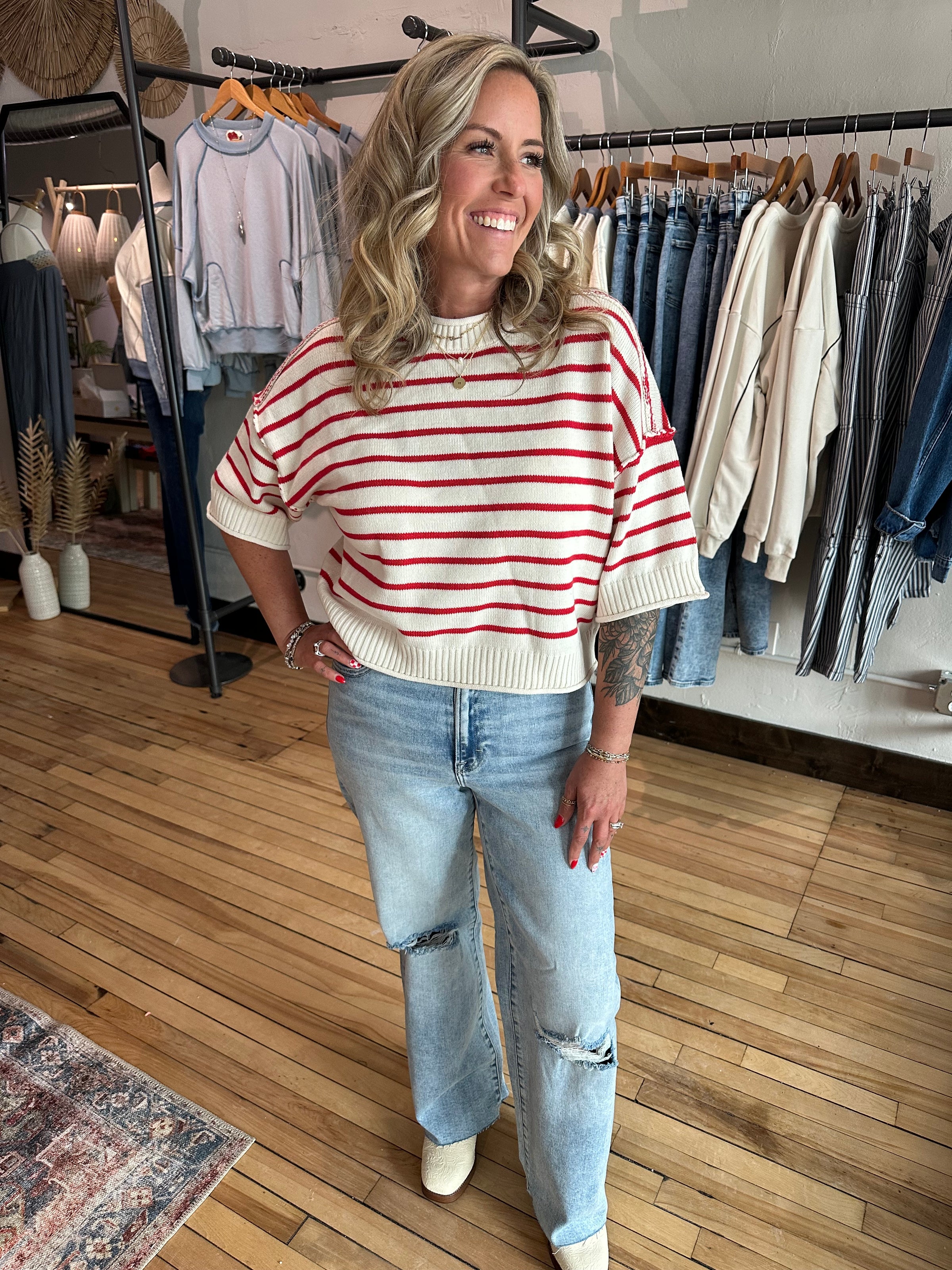 A relaxed short-sleeve sweater with a subtle striped pattern and raw edge detailing. Designed with a drop shoulder and easy fit for effortless, everyday wear.