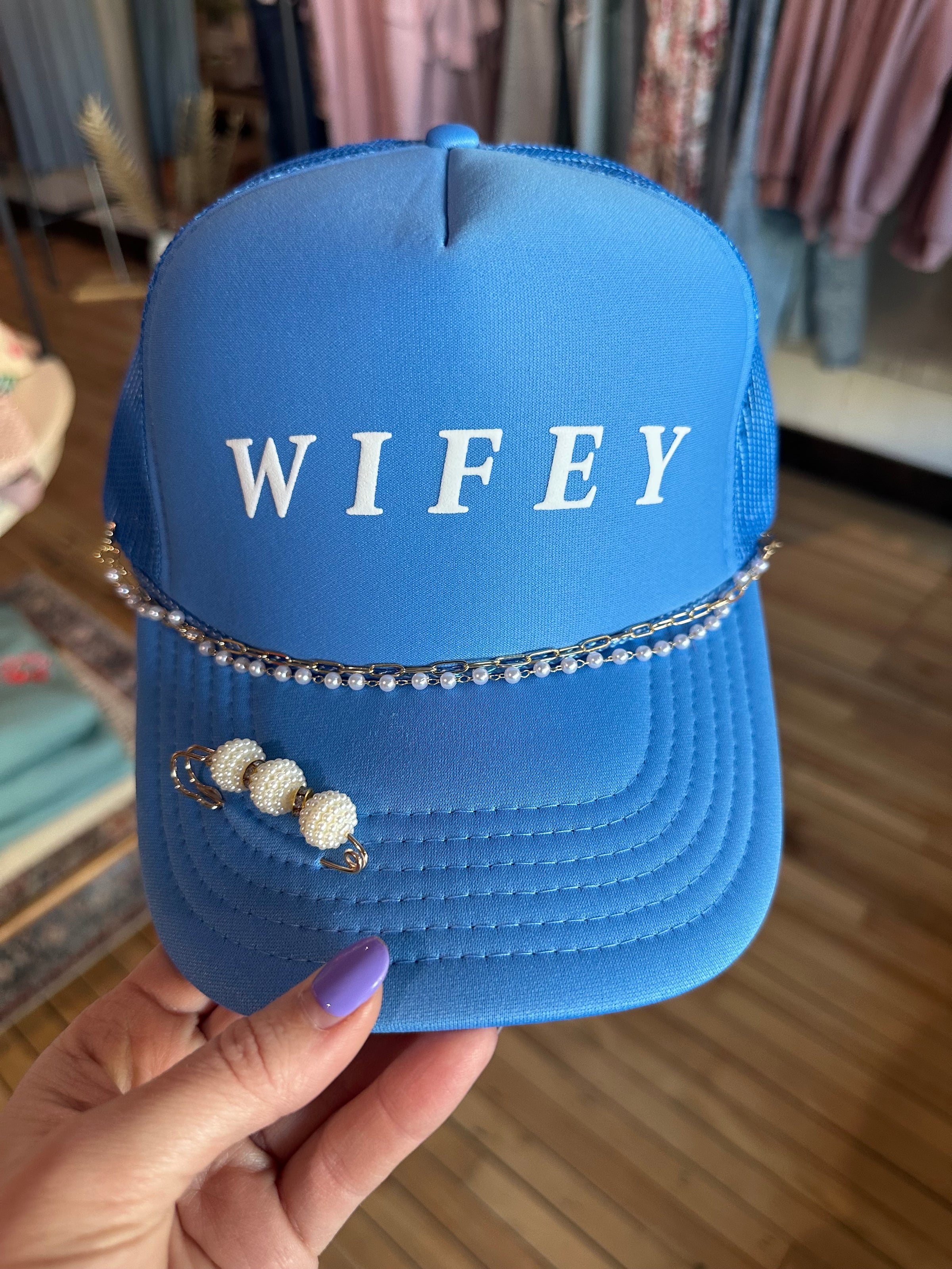 A refined trucker hat in a soft blue hue featuring subtle “Wifey” lettering. Designed with a breathable mesh back and comfortable fit for effortless everyday wear.